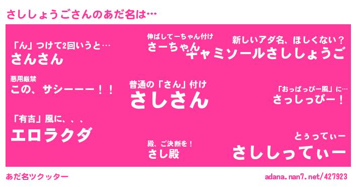| ヘコむあだ名 | 『さしふぇ~』『豆乳』『さしぷりん』『さししょうご(小並感)』 |