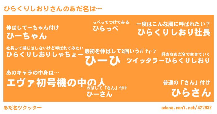 | 欧米人風あだ名 | 『ひらくりしおりクリステル』『ダニエルひらくりしおり』 |