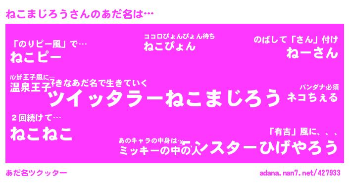 | 意味不明あだ名 | 『住所不定無職ねこまじろう(40歳)』『自称ねこまじろう』 |