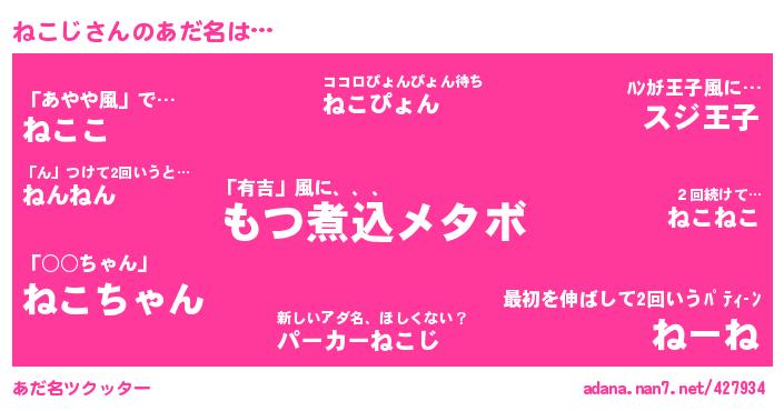 | ヘコむあだ名 | 『ねこふぇ~』『豆乳』『ねこぷりん』『ねこじ(小並感)』 |