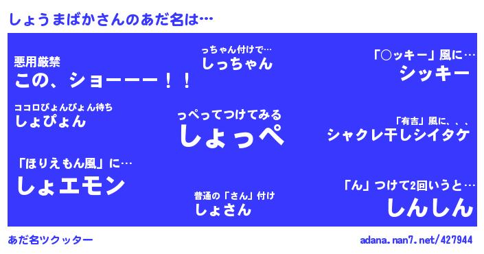 | ヒーロー風カッコイイあだ名 | 『ウルトラしょうまばかマン』『仮面ショダー』『スーパーショウマバカ』 |