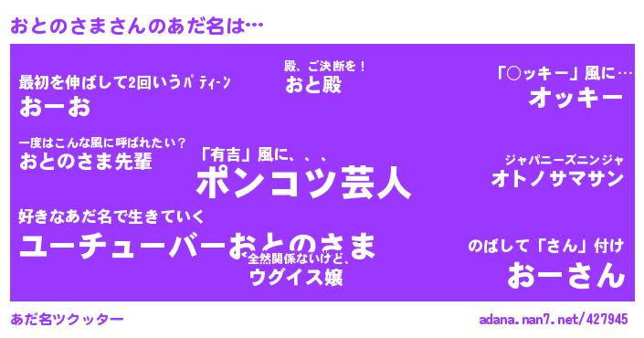 | 男性向けラノベタイトル風あだ名 | 『Re:おとのさまから始める異世界生活』『ノーゲーム・ノーオトノサマ』 |