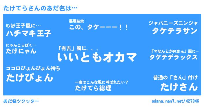 | ヘコむあだ名 | 『たけふぇ~』『豆乳』『たけぷりん』『たけてら(小並感)』 |