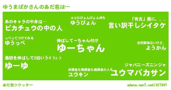 | 男性向けラノベタイトル風あだ名 | 『ゆうまばか~年齢イコール彼女いない歴の魔法使い~』『ゆうまばかの憂鬱』 |