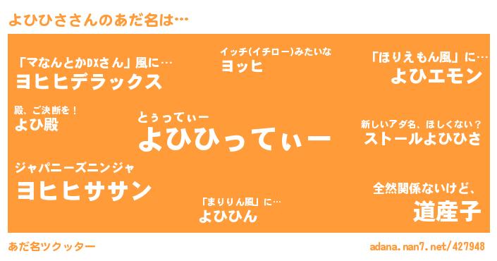 | 男性向けラノベタイトル風あだ名 | 『よひひさ~年齢イコール彼女いない歴の魔法使い~』 |