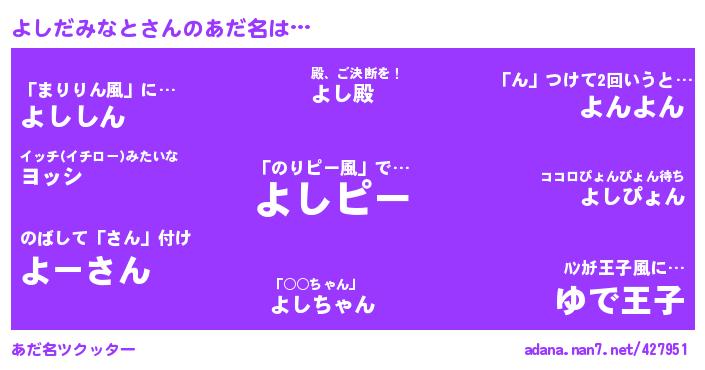 | 欧米人風あだ名 | 『アンジェラ・よしだみなと』『ダニエルよしだみなと』 |