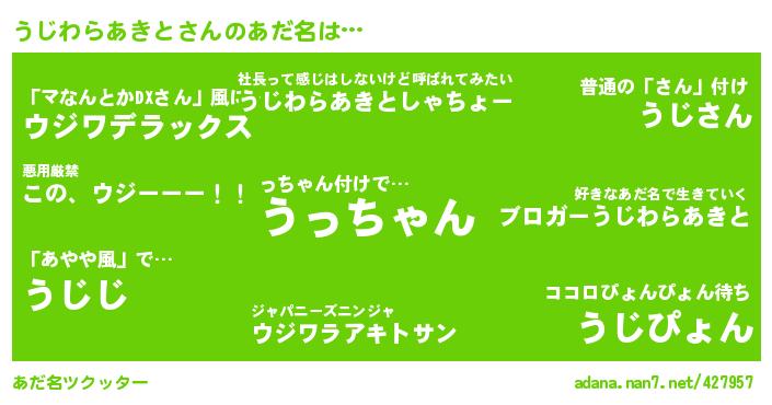 | ヒーロー風カッコイイあだ名 | 『究極戦士ウジワラアキト』『魔戒騎士ウジ』『仮面ウジダー』 |