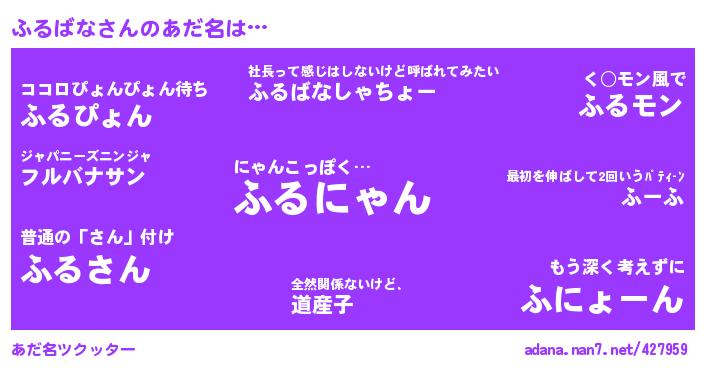 | 女子向けラノベタイトル風あだ名 | 『異世界でカフェふるばなを開店しました。』『ふるばなの玉の輿計画!』 |