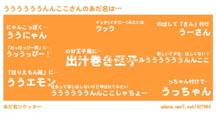 | けものフレンズ | 『ウーウル』『ううんちゃん』『ううき』『ウウリパーク』 |