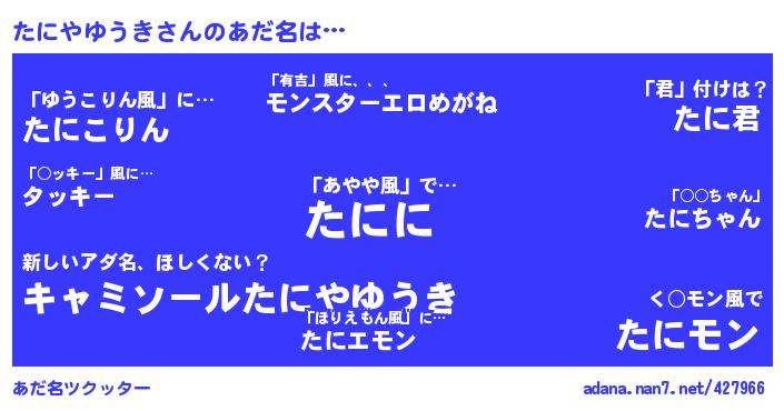 | 男性向けラノベタイトル風あだ名 | 『タニヤユウキアートオンライン』『はたらくたにやゆうきさま!』 |