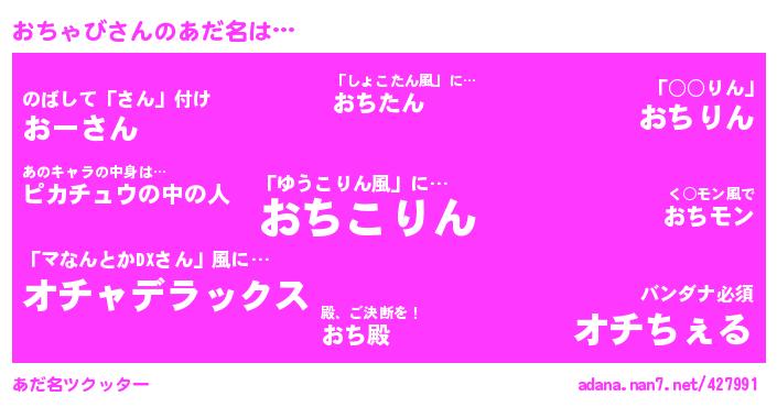 | 男性向けラノベタイトル風あだ名 | 『この素晴らしい世界におちゃびを!』『おちゃびの憂鬱』 |