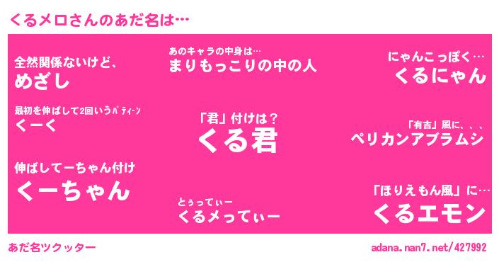| ヘコむあだ名 | 『くるふぇ~』『豆乳』『くるぷりん』『くるメロ(小並感)』 |