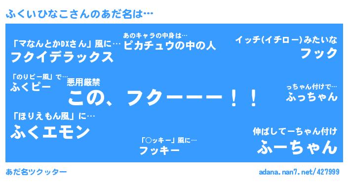 | 恥ずかしいあだ名 | 『プリティーふくいひなこ』『フクリンリン』『フクイヒナコデラックス』 |