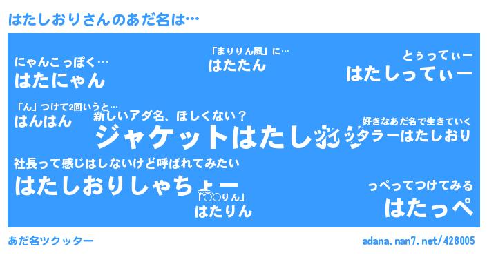| ヘコむあだ名 | 『はたふぇ~』『豆乳』『はたぷりん』『はたしおり(小並感)』 |