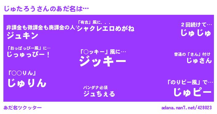 | ヘコむあだ名 | 『じゅふぇ~』『豆乳』『じゅぷりん』『じゅたろう(小並感)』 |