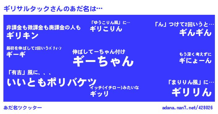 | 女子向けラノベタイトル風あだ名 | 『ギリサルタック様がみてる』『ギリサルタック姫と円卓の騎士』 |