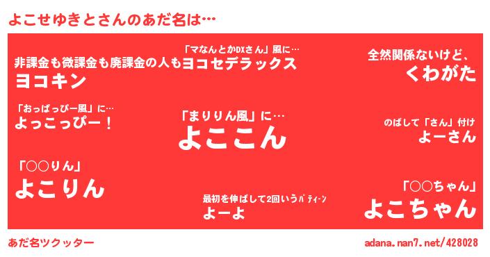 | ファンタジー風あだ名 | 『ファントムヨコス』『エターナルヨコセユキトー』『ユリヨコヴァット』 |