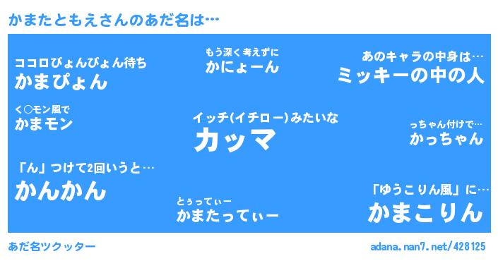 | 意味不明あだ名 | 『住所不定無職かまたともえ(40歳)』『かまたともえフォーエバー』 |