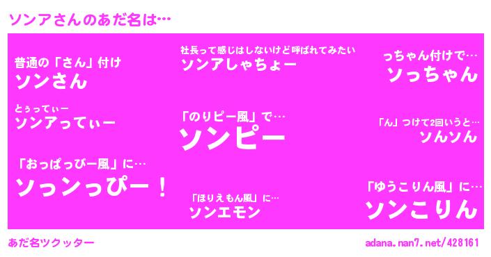 | ヒーロー風カッコイイあだ名 | 『ネオソンア』『ウルトラソンアマン』『サイバー戦士ソンア』 |