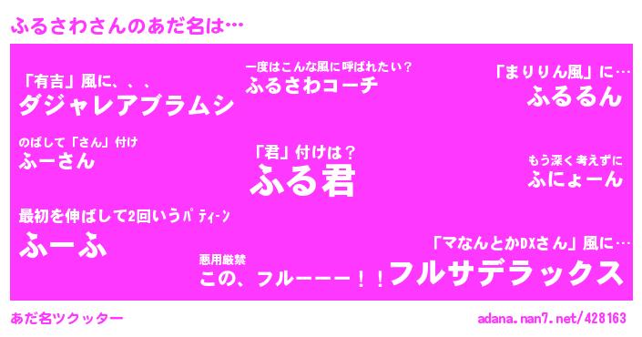 | 男性向けラノベタイトル風あだ名 | 『Re:ふるさわから始める異世界生活』『ふるさわの憂鬱』 |