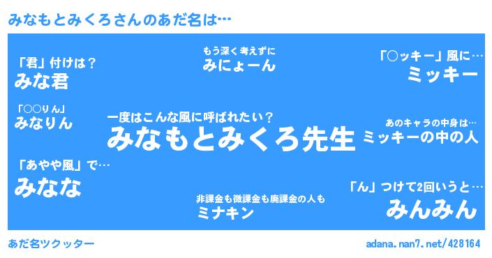 | 意味不明あだ名 | 『みなもとみくろフォーエバー』『自称みなもとみくろ』 |
