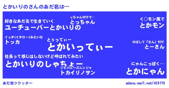| ヘコむあだ名 | 『とかふぇ~』『豆乳』『とかぷりん』『とかいりの(小並感)』 |