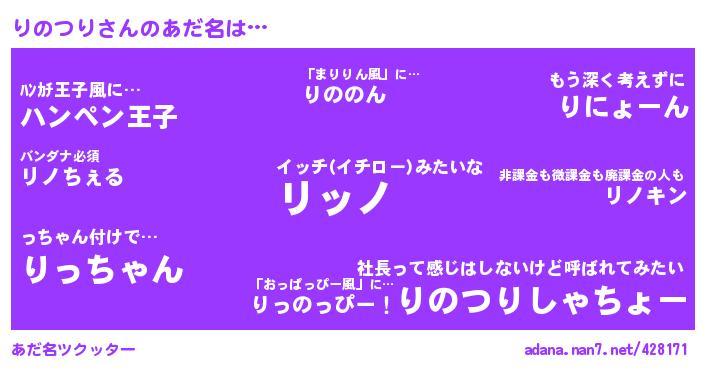 | ヘコむあだ名 | 『りのふぇ~』『豆乳』『りのぷりん』『りのつり(小並感)』 |