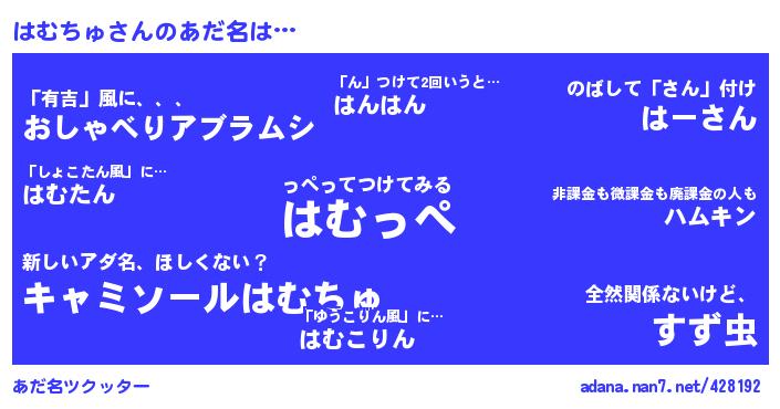 | 女子向けラノベタイトル風あだ名 | 『はむちゅストレイドッグス』『はむちゅ恋絵巻』『はむちゅ伯爵の花嫁』 |