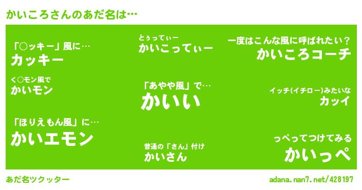 | 欧米人風あだ名 | 『ダレノガレかいころ』『ウサインかいころ』『アンジェラ・かいころ』 |