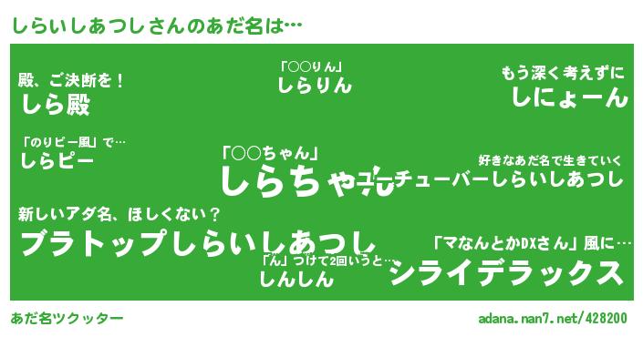 | ヒーロー風カッコイイあだ名 | 『ネオシライシアツシ』『ウルトラ戦士シライシアツシ』『暗黒騎士シラ』 |