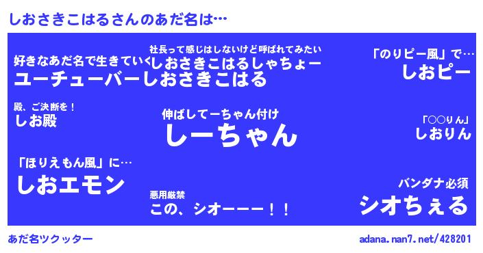| 女子向けラノベタイトル風あだ名 | 『しおさきこはるの玉の輿計画!』『しおさきこはるの卵を拾いまして』 |