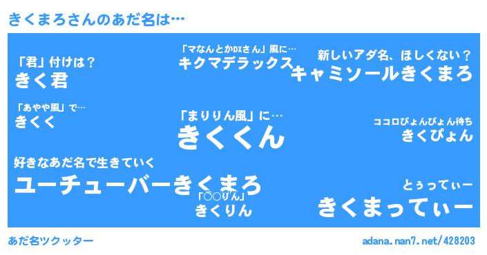 | 女子向けラノベタイトル風あだ名 | 『きくまろの婚約者』『きくまろの卵を拾いまして』『きくまろの契約王妃』 |