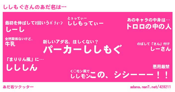| ヒーロー風カッコイイあだ名 | 『ウルトラししもぐマン』『友情の使者ししもぐ』『幻影騎士シシ』 |
