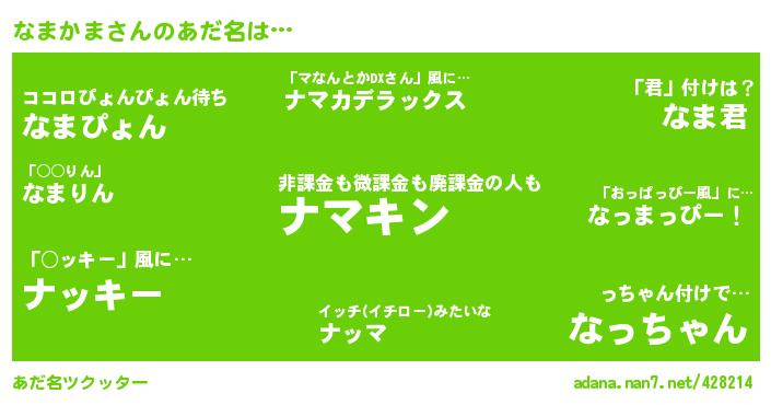 | 意味不明あだ名 | 『ペロリンなまかま』『住所不定無職なまかま(79歳)』『自称なまかま』 |