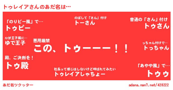 | 男性向けラノベタイトル風あだ名 | 『トゥレイアアートオンライン』『転生したらトゥレイアだった件』 |