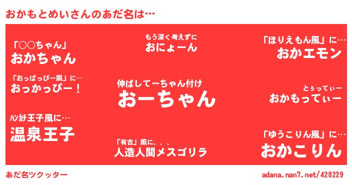 | ポケモン風あだ名 | 『オーカイ』『メロオッカ』『ヒオカモトメイ』『ゼニオカ』 |