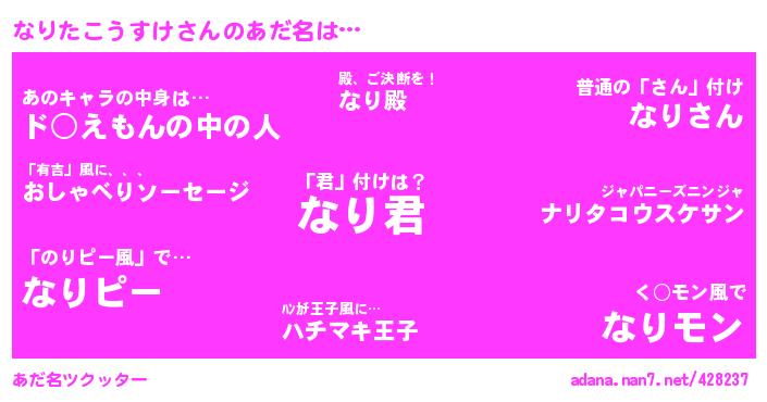 | ヘコむあだ名 | 『なりふぇ~』『豆乳』『なりぷりん』『なりたこうすけ(小並感)』 |