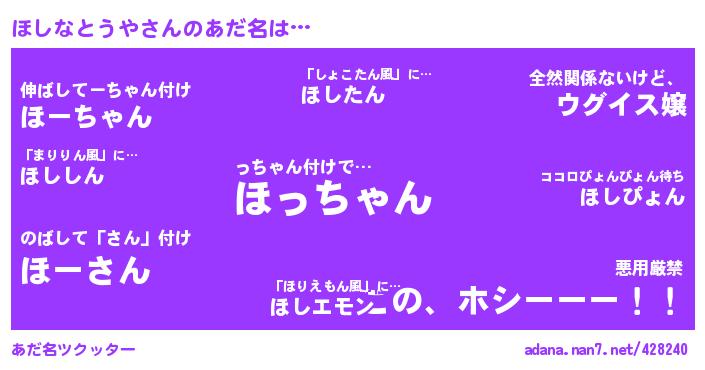 | 意味不明あだ名 | 『自称ほしなとうや』『ほしなとうやフォーエバー』 |