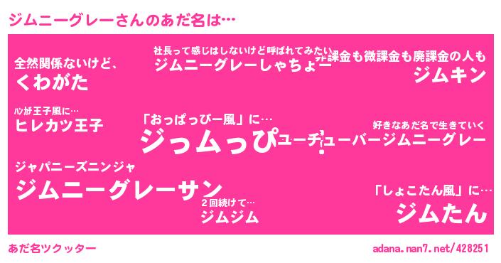 | ポケモン風あだ名 | 『ゼニジム』『ジムニダネ』『ヒジムニーグレー』『ジムチュウ』 |