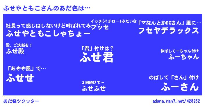 | ヒーロー風カッコイイあだ名 | 『究極戦士フセヤトモコ』『ウルトラふせやともこマン』『仮面フセダー』 |