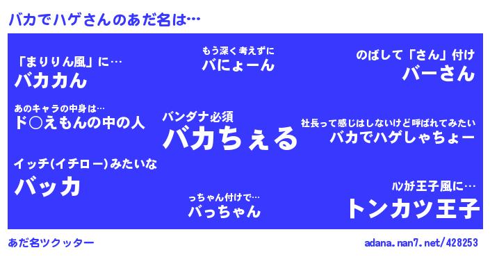 | ヒーロー風カッコイイあだ名 | 『炎刃騎士バカ』『ウルトラ戦士バカデハゲ』『ネオバカデハゲ』 |