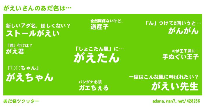 | 意味不明あだ名 | 『自称がえい』『がえいフォーエバー』『住所不定無職がえい(95歳)』 |