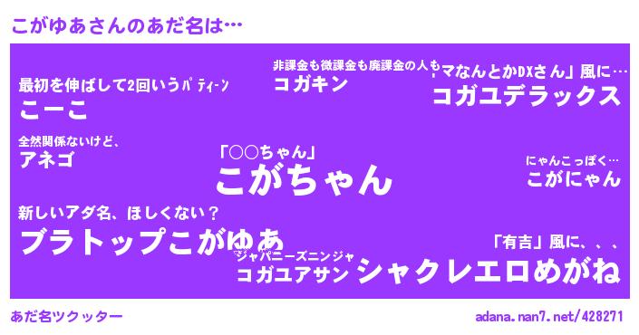 | ヘコむあだ名 | 『こがふぇ~』『豆乳』『こがぷりん』『こがゆあ(小並感)』 |