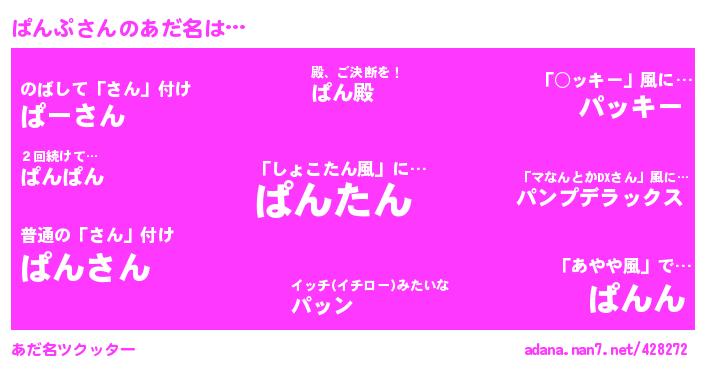 | 男性向けラノベタイトル風あだ名 | 『Re:ぱんぷから始める異世界生活』『ぱんぷの憂鬱』 |