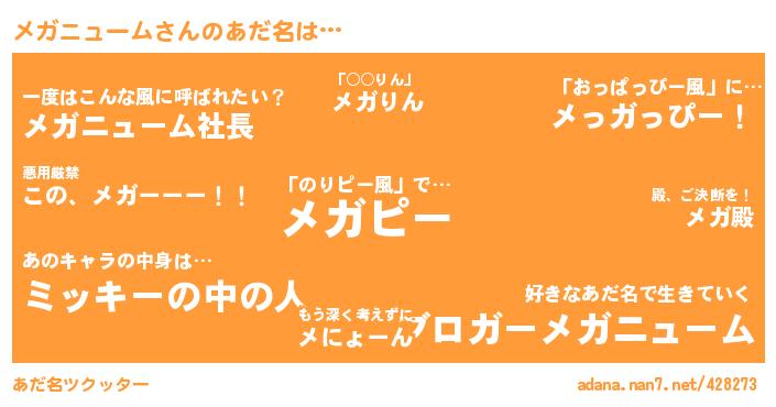 | 女子向けラノベタイトル風あだ名 | 『死神メガニュームの再婚』『シンデレラメガニューム家の靴箱館』 |