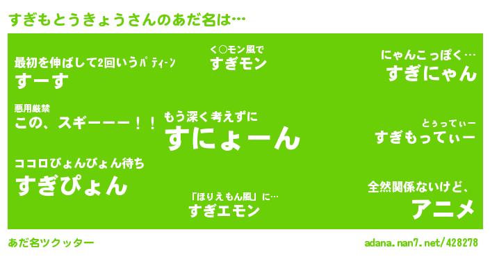 | けものフレンズ | 『すぎんちゃん』『スギリパーク』『スーギル』『スギリアン』 |