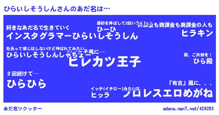 | 意味不明あだ名 | 『住所不定無職ひらいしそうしん(40歳)』『ひらいしそうしんフォーエバー』 |
