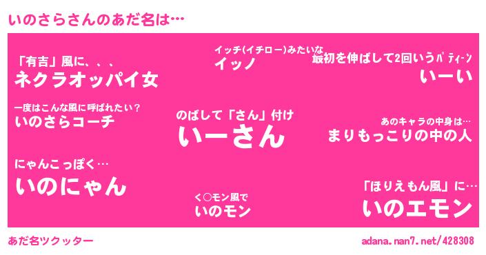 | ポケモン風あだ名 | 『イノサダネ』『メロイッノ』『ゼニイノ』『イノチュウ』 |