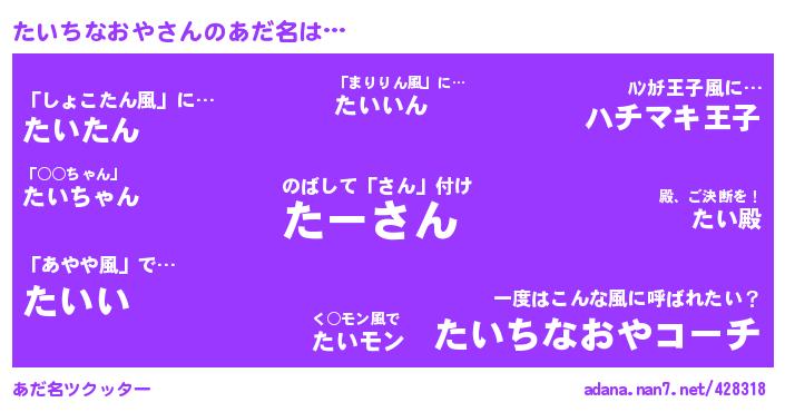 | ヒーロー風カッコイイあだ名 | 『仮面タイダー』『スーパータイチナオヤ』『ネオタイチナオヤ』 |