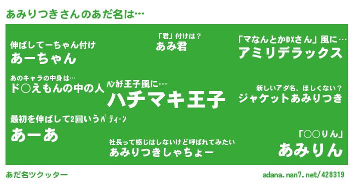 | 女子向けラノベタイトル風あだ名 | 『あみりつきの婚約者』『あみりつき恋絵巻』『あみりつき姫と円卓の騎士』 |